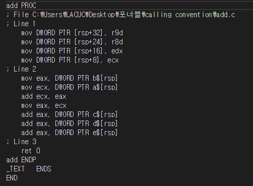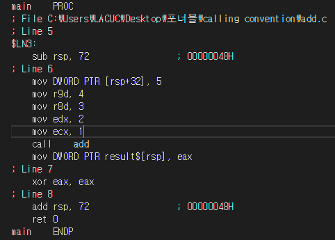 메인함수에서 다른 콜링컨벤션들과 다른 부분은 레지스터로만 인자를 전달하기 때문에 call add이후에 add rsp를 통해 스택포인터를 복구하는 명령어가 없는 점 입니다.