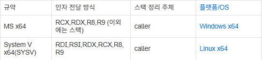 저번에 포스팅할 때 썼던 함수호출규약표 입니다. 저번에 32비트안의 콜링컨벤션 사이에서는 스택 정리 주체에 따라 cdecl과 stdcall의 구분이 가능했었는데, 64비트 콜링컨벤션을 보면 전부 caller로 같은 걸 볼 수 있습니다.