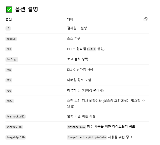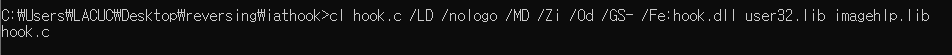 hook.c /LD /nologo /MD /Zi /Od /GS- /Fe:hook.dll user32.lib imagehlp.lib