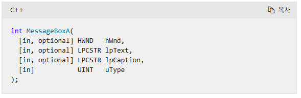 typedef int (WINAPI *MSGBOXA)(HWND, LPCSTR, LPCSTR, UINT); //포인터타입 생성