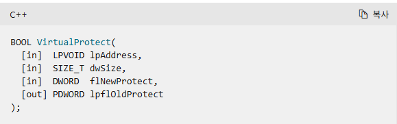 시작주소는 ppfn, 변경할 크기는 PROC의 사이즈, 보호옵션은 READ&WRITE고 마지막 포인트에 새로 만든 DWORD 변수인 dwOldProtect를 넣어서 기존 속성을 저장해둡니다.