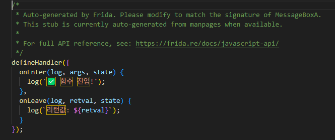 저희가 원하는 함수를 넣으면 Frida가 알아서 entry point 주소를 찾아내줘서 매우 편리한 기능을 제공합니다.