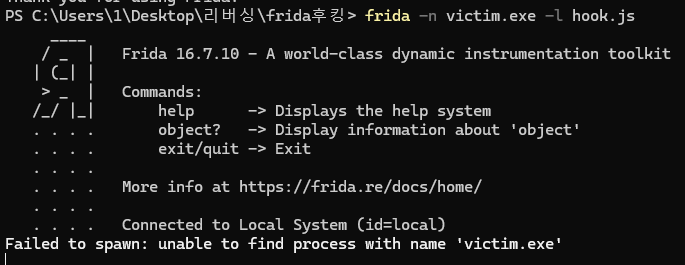 따라서 명령어를 입력해주어도 unable to find process가 뜨면서 오류가 발생하는데, 저희가 작성한 victim.exe가 굉장히 짧고 실행되자마자 출력 후 종료되는 코드이기 때문에 코드가 실행되기 전에 hook.js가 실행되게 해야합니다.