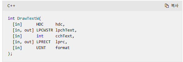 https://learn.microsoft.com/ko-kr/windows/win32/api/winuser/nf-winuser-drawtextw