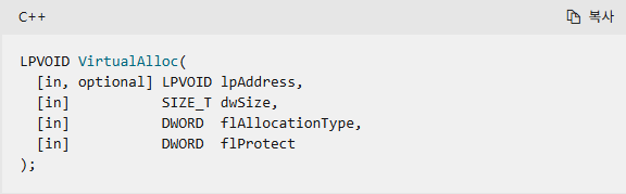 https://learn.microsoft.com/ko-kr/windows/win32/api/memoryapi/nf-memoryapi-virtualalloc