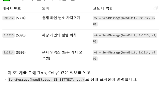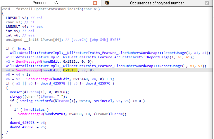 SendMessage의 2번째 인자(uMSG)로 들어가는 5394,5395,5396,14,184중에서 5394~5396은 표준 Win32에서 정의되지 않은 값이고 notepad내부에서만 정의된 인자값입니다.