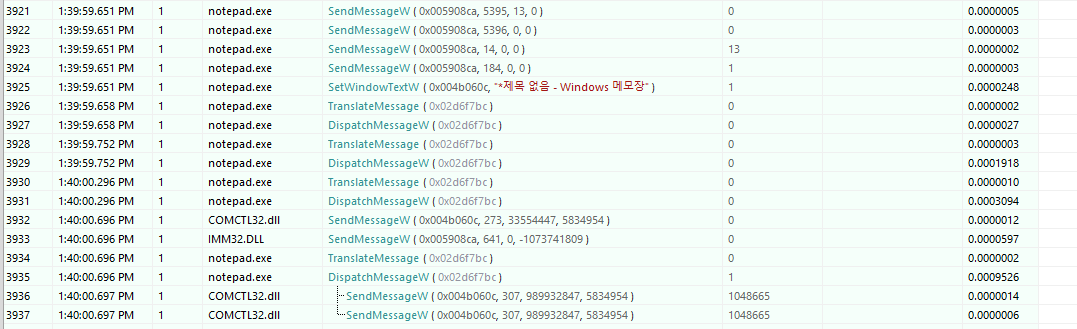 이러한 동작 메세지들을 SendMessageW의 인자로 넣어서 전송하게 됩니다.