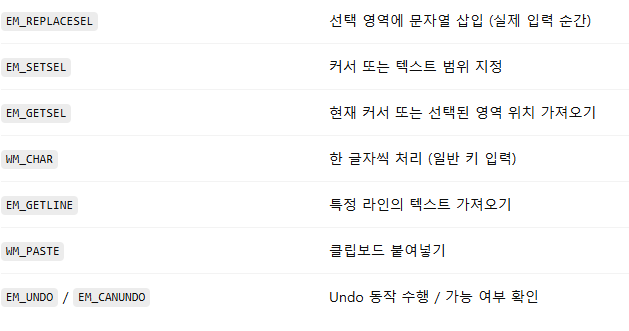 Edit 클래스는 자체적으로 텍스트 버퍼를 가지고 있는데, EM_REPLACESEL 메세지를 받으면 버퍼에 문자열을 삽입하는 형식으로 문자열 입력이 이루어집니다.
