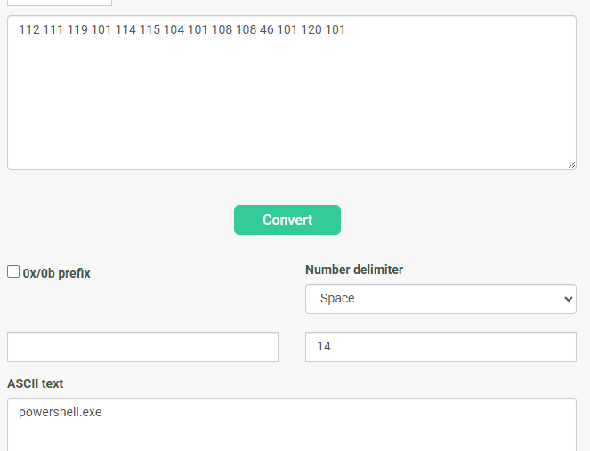 즉 아까의 119|112 이런 형태로 저장되어있던 powershell.exe 문자가 아스키코드값으로 변환되어서 deepened에 powershell.exe로 저장되어있는 형태입니다.