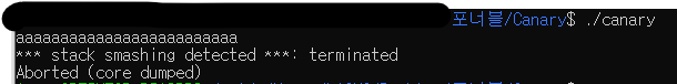 아까와는 다르게 stack smashing detected라는 문구가 뜨면서 강제 종료됩니다.