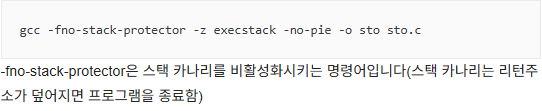저희가 저번에 스택 버퍼 오버플로우를 공부하면서 스택카나리를 비활성화시키는 명령어를 사용했었습니다.