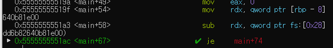 그리고 메인이 진행되다가 마지막 부분에 rdx에 rbp-0x8에 저장된 값과 맨처음 랜덤값을 가져온 fs:0x28의 값이 동일한지 확인해서 같으면 main으로 je(jump equal)을 진행하는 방식입니다.