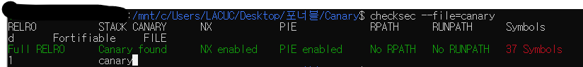 보호기법의 적용 여부는 리눅스나 gdb에서 checksec 명령어를 통해 확인 가능합니다.