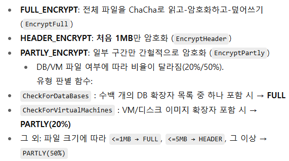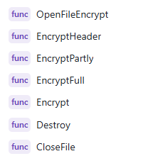 해당 Encrypt함수이고, 해당 함수에서 키를 생성하고, 파일을 열고, 메타데이터를 기록하고, 실제로 암호화를 진행하는 함수인 EncryptFull(), EncryptHeader(), EncryptPartly()함수를 호출합니다.