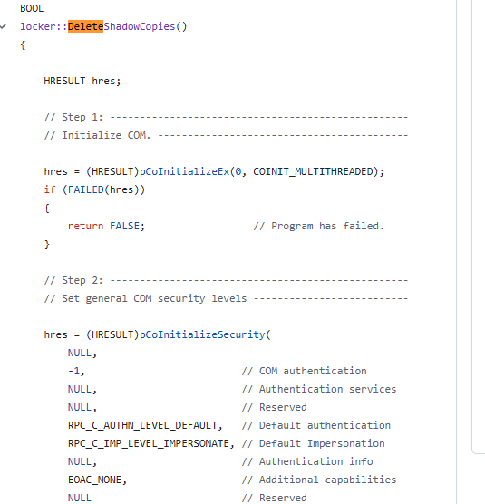 해당 함수는 WMI COM API를 이용해 시스템의 볼륨 섀도 복사본을 찾아 삭제하는 루틴입니다.