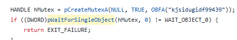 다음으로 랜섬웨어는 "kjsidugidf99439"라는 하드코딩된 이름을 가진 뮤텍스를 생성합니다. 마찬가지로 OBFA매크로를 통해 난독화됩니다.