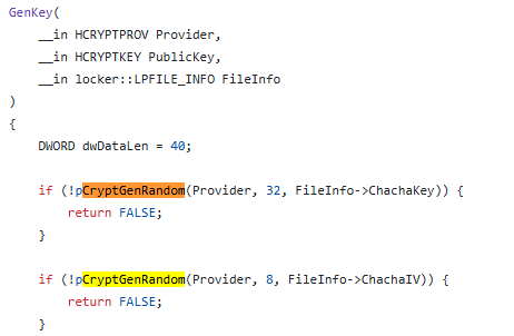 해당 함수에서 CryptgenRandom API를 통해 32바이트의 난수 키와 8바이트 난수 초기 벡터를 생성하고 FileInfo에 저장합니다.