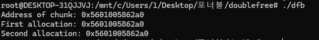 이렇게 동일한 주소가 두 번 반환되었으면, Tcache Duplication 공격이 성공한 것이고, DFB 방어 로직 우회에 성공한 것입니다.