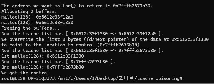 다시 malloc(128)을 통해 동적 할당 진행시 tcache는 해당 주소를 반환하고 c 포인터는 스택 주소를 가지게 됩니다.