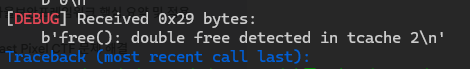이것저것 해보니 할당 ->해제->수정->할당*2->해제*2를 하면 Tcache가 오염된 상태에서 할당과 해제를 반복해서 힙 구조가 망가진거라 합니다.