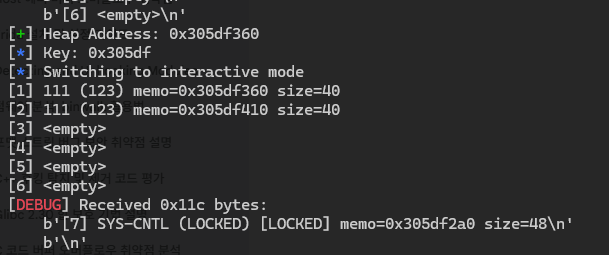 6번 list_reg를 사용하면 SYS_CNTL이 들어있는ㄷ 주소를 알려줍니다(0번에다 힙을 할당한 뒤 6번을 출력해도 힙 주소를 획득할수 있습니다) 해당 메모에서의 주소를 저장하고 하위 12비트 제거 후 키 값으로 쓰면 됩니다