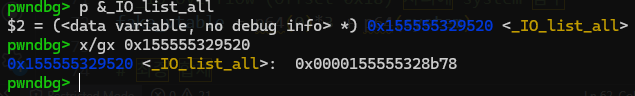 일단 _IO_list_all이 가르키는 위치를 확인해보았을 때, 기존처럼 stderr를 가르키는것이아닌 b78로 끝나는 주소를 가르킨다는 것은 unsorted bin attack 이 성공했음을 의미합니다.. 그나마 희소식이네요