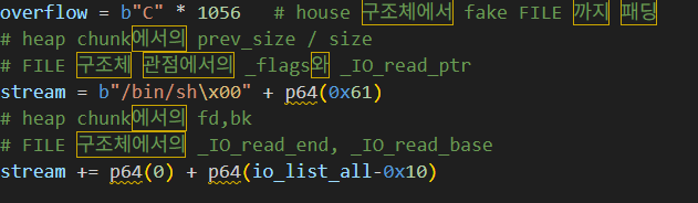 여기서 payload의 5번째줄 보시면 io_list_all을 설정하는데 이건 bk의 위치에다가 해당 주소값을 넣는 과정입니다(-0x10으로 설정하는 건 C언어의 내부 구조체 접근 방식때문입니다.)