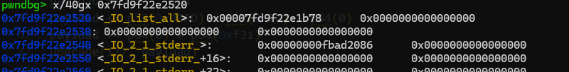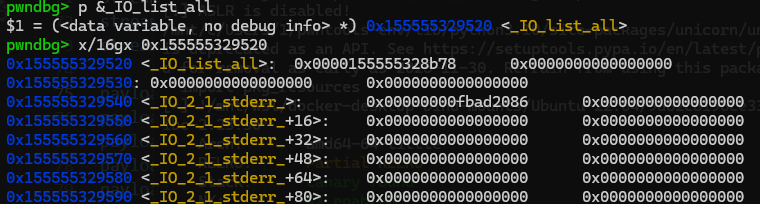 이러면 라이브러리 릭을 통해 라이브러리 베이스 주소값을 구할 수 있고, FSOP 공격 전 세팅은 완료 된 듯 합니다.
