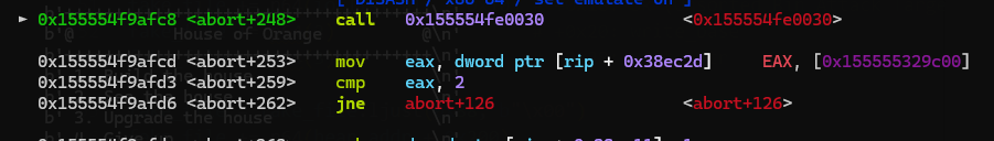 이렇게 가짜 구조체를 완성하고 나면 Upgrade로 오버플로우를 일으키고 덮어쓴 뒤 다시 청크를 할당하면 malloc을 할당하는 과정에서 abort가 발생하고 abort -> IO_list_all -> fake vtable로 타고타고 가게 됩니다.