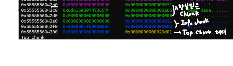 2. 맨 아래 0x..4300 부분의 마지막에 20d01이라는 숫자가 보이는데, 해당 숫자는 Top Chunk의 Size필드라고 합니다 이 필드는 정확히 0x555555604308에 존재합니다.