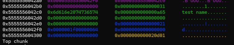 1. 메모리 덤프를 보면 0x42b0의 마지막 부분에 0x31(청크 크기)가 보이고 그 뒤 문자에 test name이라는 저희가 입력한 값이 보입니다.