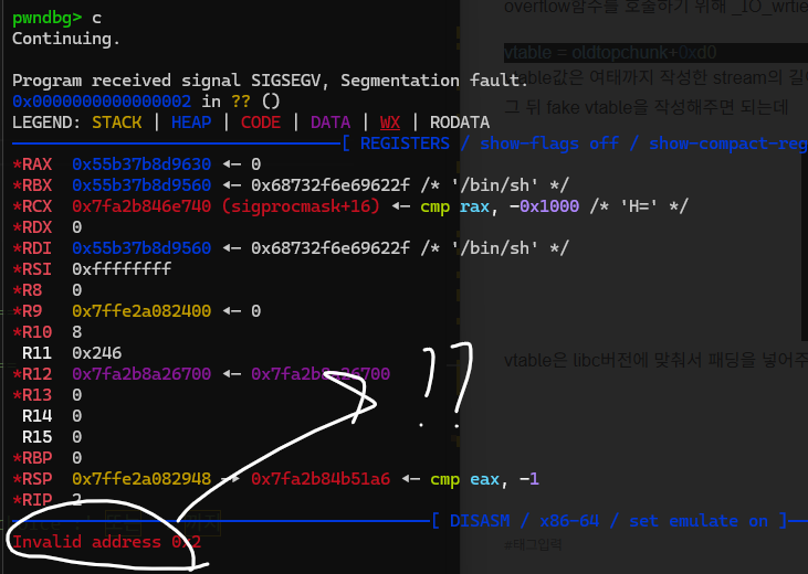 또한 main_arena + 88에 해당하는 값이 fp->_mode <= 0이고 fp->_IO_write_ptr > fp->_IO_write_base라는 조건을 우연하게 통과하는 바람에 bin 6번에 해당하는 값이 실행되지 않고 vtable 실행을 시도해 c38로 호출이 된다고 하는ㄷ ㅔ..