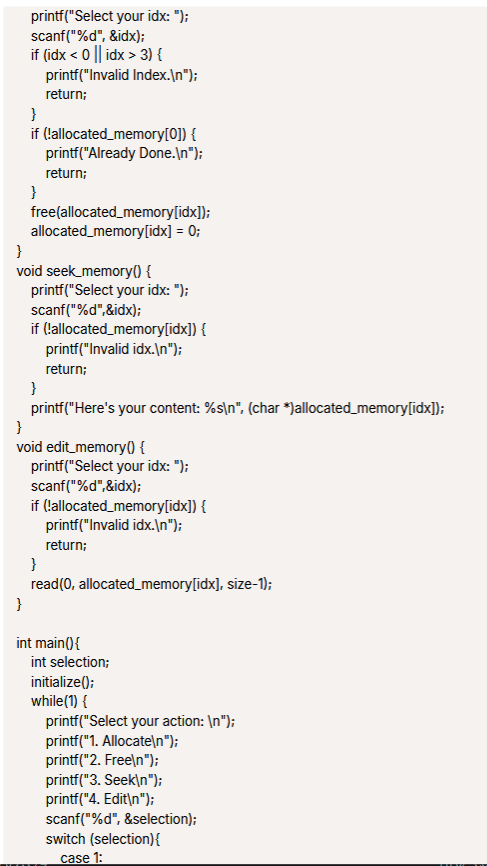 edit_memory 함수에서 발생하는데 scanf에서 idx에 대한 음수/양수 범위 검사가 없고, 검증되지 않은 주소에 데이터를 씁니다.