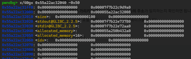 여기서 idx에 음수를 넣으면 allocated_memory배열의 시작 주소보다 앞쪽에 있는 메모리를 출력할 수 있습니다.