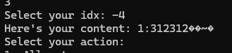 메뉴 1번 allocate -> 메뉴 4번에서 idx값에 -4 -> 메뉴 3번에서 idx -4 순서대로 진행하면
