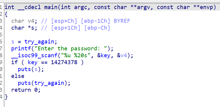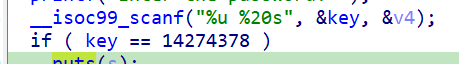 입력을 두개 받는데 하나는 key 값이므로 첫번째 입력은 14274378일 것이고, 위의 소스코드에서 key가 일치하는 케이스에서 어떤 scanf인자가 들어갈 때 puts가 출력하는 메모리 번지가 Goodjob의 메모리 번지와 일치하는지를 찾아야 될 것 같습니다.