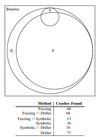 Driller와 Fuzzing에 대한 원의 크기가 드라마틱하게 커지진 않았지만, Fuzzing만으로 푼 문제에 대한 100%를 Driller로 풀 수 있었고, 마찬가지로 Symbolic으로 풀 수 있던 문제도 100% Driller로 풀 수 있습니다.