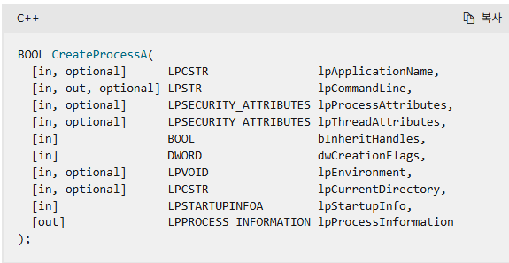 해당 부분은 아까 봤던 순서중 ① CreateProcess로 일시 정지된 상태로 실행 부분입니다.