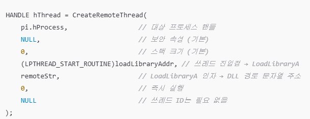 이런 과정을 거치는 이유는 타겟 프로세스에 dll을 로드하려면 그 프로세스가 직접 LoadLibraryA를 호출해야하기 때문입니다.