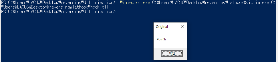 저번에 iat후킹할 때 만들어둔 파일들로 한번 잘 되는지 실행해보겠습니다. 저희가 만든 c코드에는 인자를 입력하는 부분이 없기 때문에 cmd로 인자를 넣어서 실행해줘야합니다.