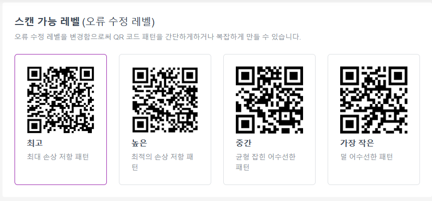 QR코드에 ECC레벨(오류 정정 레벨)이 있는데 L(=7%),M(=15%),Q(=25%),H(=35%)가 있으며 숫자가 높아질 수록 복원력(*손상되어도 인식 가능)이 올라가는데 수용 용량이 내려갑니다.