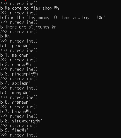 먼저 한번의 for문 반복당 아이템이 10개씩 출력되므로, for문을 작성했고 flag라는 바이트문자가 나올때까지 r.recvline()으로 한줄씩 받다가 flag가 나오면 number에 저장하고 반복문을 break합니다