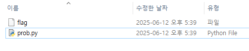 먼저 문제를 다운받으면 전포스팅과 마찬가지로 flag와 prob.py가 있습니다.