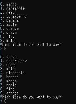 또 "Which item do you want to buy?"라는 문자열과 함께 choice라는 함수로 사용자의 입력을 받은 뒤 입력한 인덱스 값이 flag일경우 50회 반복, 틀릴경우 프로그램을 종료합니다.