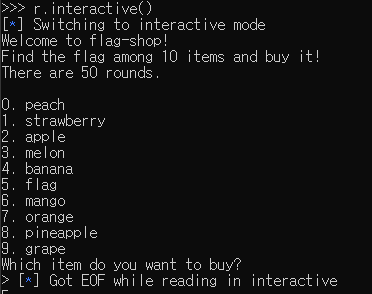 먼저 Welcome to flag-shop ~~부터 3줄정도 print한 뒤 items 리스트가 나옵니다.
