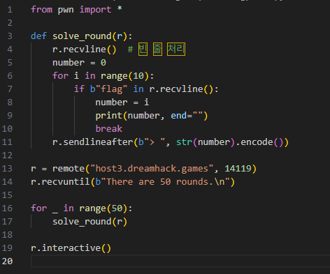 for 문 시작 전 3줄가량 문자열이 출력되므로 recvuntil()을 통해 바로 for문으로 진입할 수 있게 작성하였습니다.